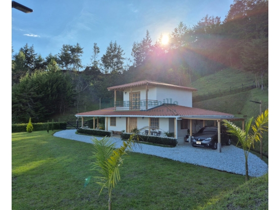 La Casa tiene 200 mt2, divina en 2 niveles, con estilo campestre y espacios muy bien distribuidos, con 3 alcobas, principal con balcón amplio, vestier y baño, cocina integral, salón comedor, zona de ropas, cuarto útil, parqueadero cubierto y corredores amplios. Con Internet, gas por pipeta, energía de EPM y servicio de agua veredal, cuenta también con sistema de cámaras y alarma.